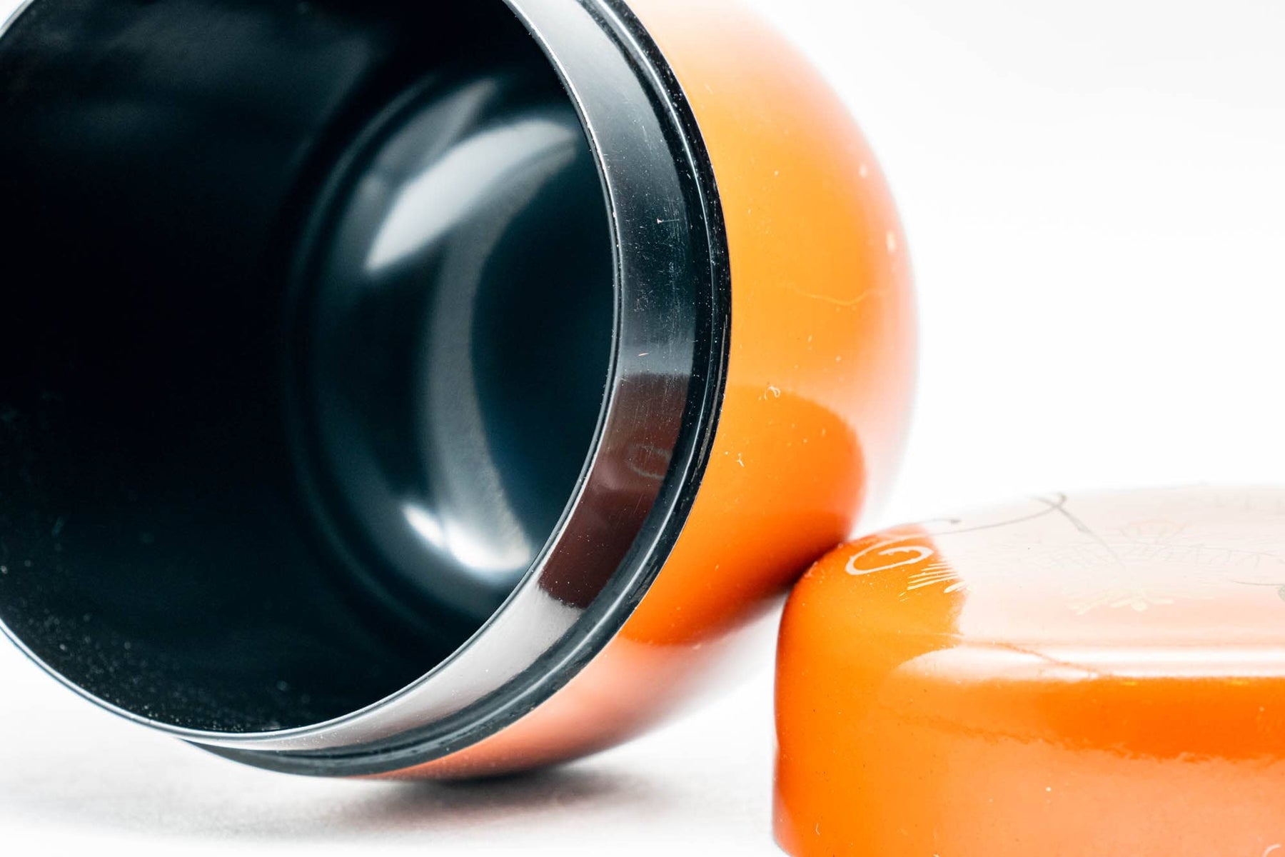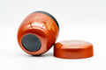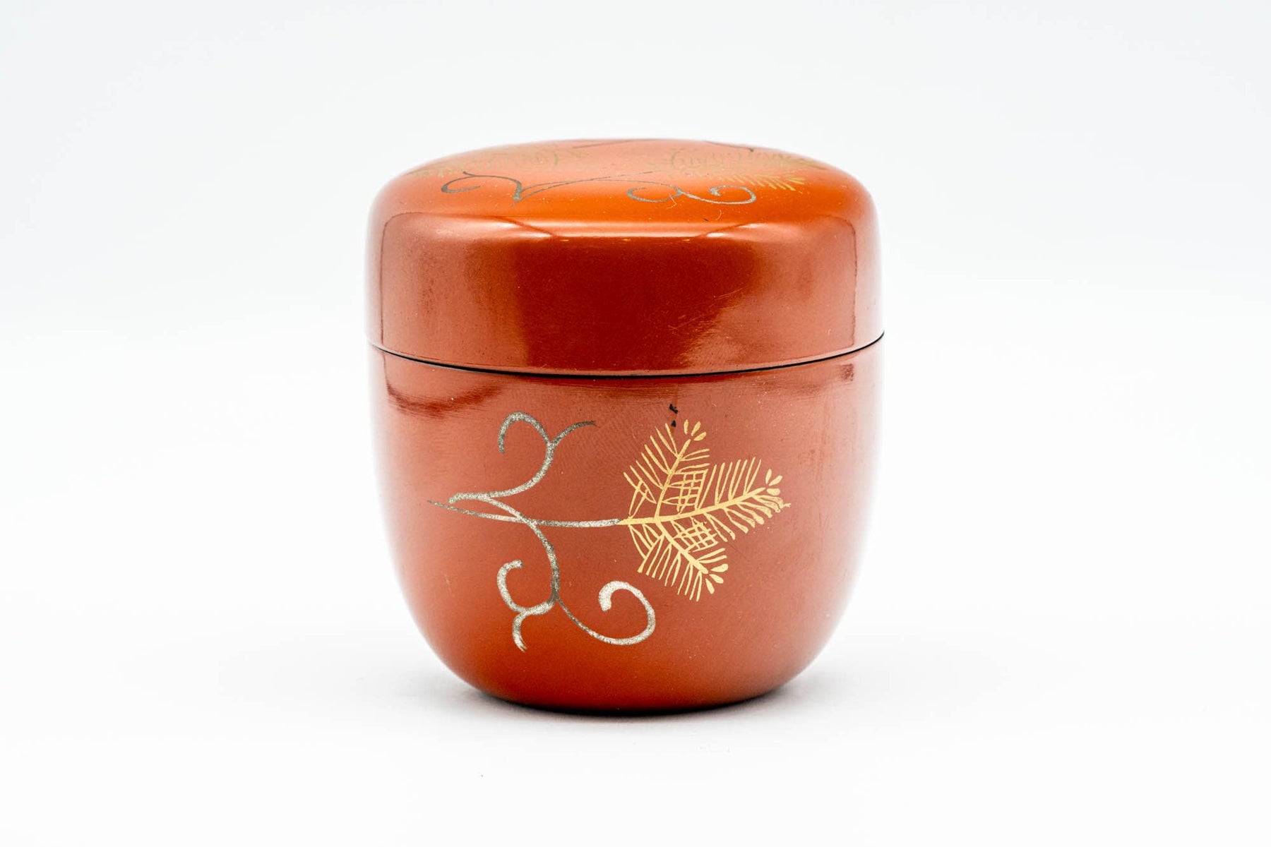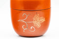 This orange-red urushi lacquer natsume (matcha caddy) is decorated with gold floral motifs across its body and lid.