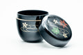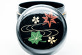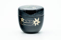 This black lacquer natsume (matcha caddy) is made from wood coated with traditional urushi lacquer and decorated with momiji maple leaves, sakura cherry blossoms, and golden swirl motifs.