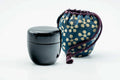 This small natsume (matcha caddy) is made from wood and coated with traditional black urushi lacquer. Comes with its custom-sized shifuku (仕服 - silk pouch) made from a brilliant blue silk brocade, decorated with geometric patterns.