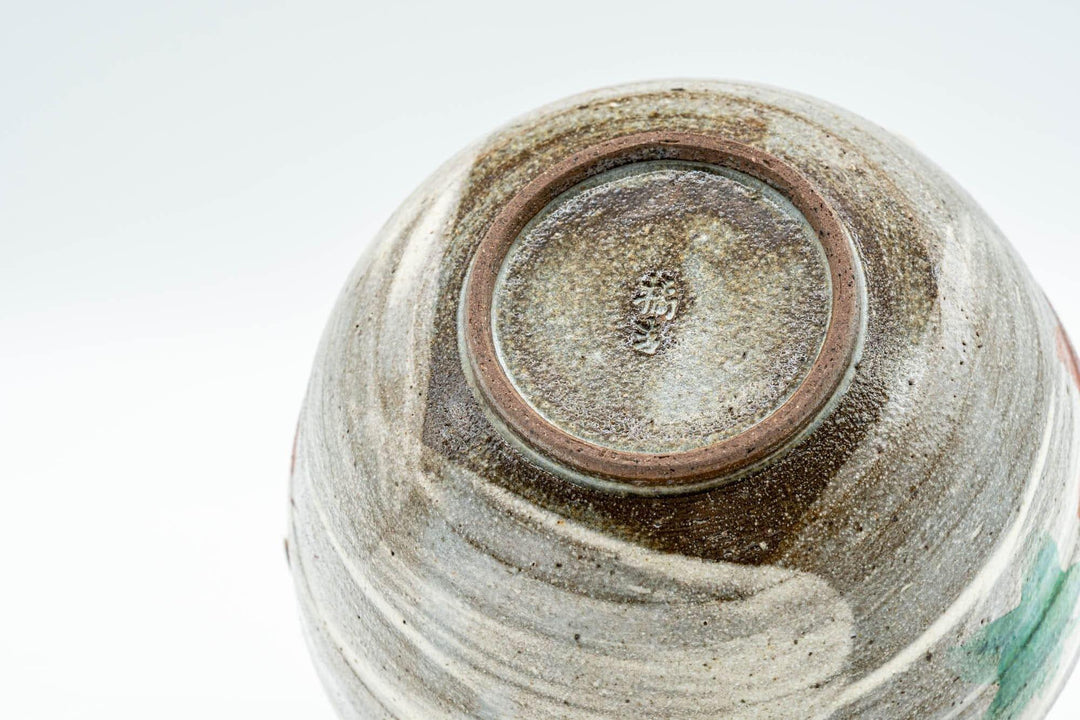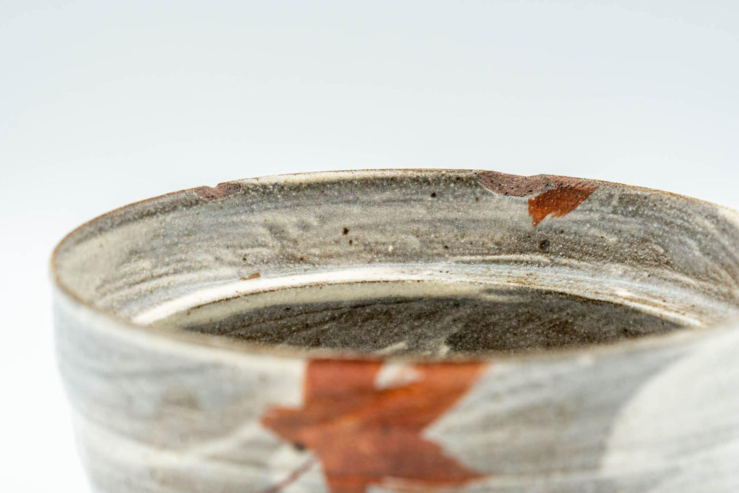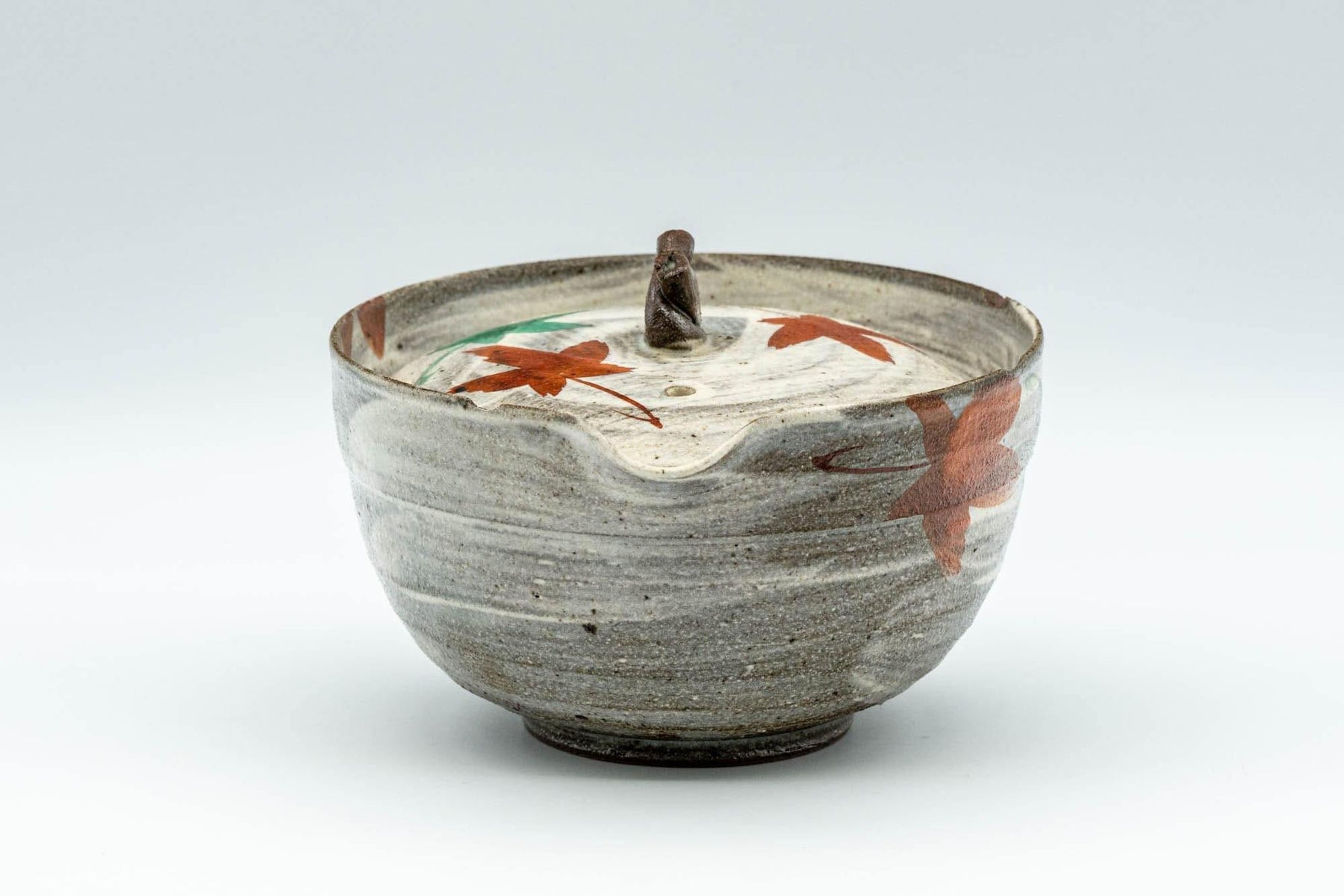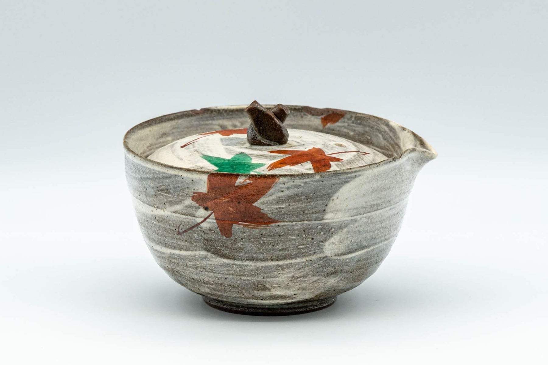 This shiboridashi (handless, filterless teapot) features a hakeme brush stroke glaze over grey and is decorated with red and green autumn momiji maple leaves.