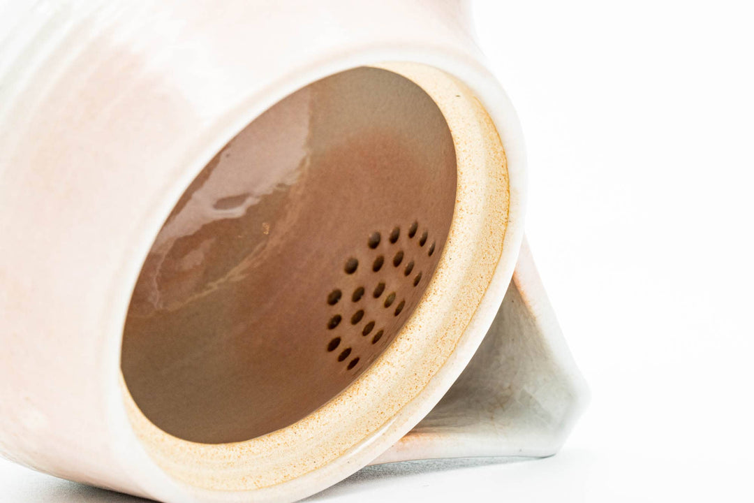 This Hagi-yaki tea set includes one kyusu (teapot) and five yunomi (teacups) each featuring a beige and pink glaze. This teapot's built-in ceramic do-ake filter is perfect for naturally straining tea.
