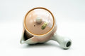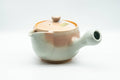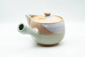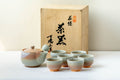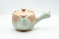 This Hagi-yaki tea set features a kyusu (teapot) and six yunomi (tea cups). The kyusu is made like a houhin, meaning that it has a wide, triangular open spout which allows for fast pouring, a simple ceramic do-ake filter which lends no metallic taste to the tea, and a wide opening which allows for easy viewing of the tea leaves and easy cleaning. This set is made from a warm, orange-hued stoneware with white glazing. Made by Tsubaki Kiln (椿窯, stamped 天鵬山).