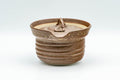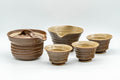 The shiboridashi has an array of many fine grooves that help filter out the leaves while pouring. Each piece features a spiraling design, a brown-glazed exterior, and a beige-glazed interior.
