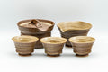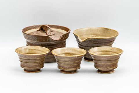 This Japanese tea set consists of a shiboridashi (handleless teapot), a heart-shaped yuzamashi (water cooler), and three yunomi (teacups), each with a warm iraho-style glaze