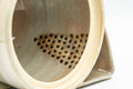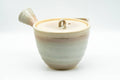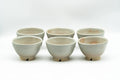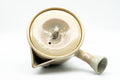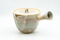This Hagi-yaki tea set features a kyusu (teapot) and six yunomi (tea cups) featuring a crazed peach glaze with warm beige 'gohonte' patterned spots.. The kyusu is made like a houhin, meaning that it has a wide, triangular open spout which allows for fast pouring, a simple ceramic do-ake filter which lends no metallic taste to the tea, and a wide opening which allows for easy viewing of the tea leaves and easy cleaning. This set is made from a warm, orange-hued stoneware with white glazing. Made by Tamaso kiln (玉祖窯)