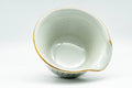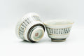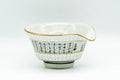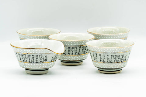 This Kutani-yaki tea set includes one katakuchi (water cooler; yuzamashi) and four yunomi (small teacups), each decorated with calligraphy and geometric patterns.