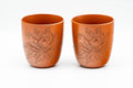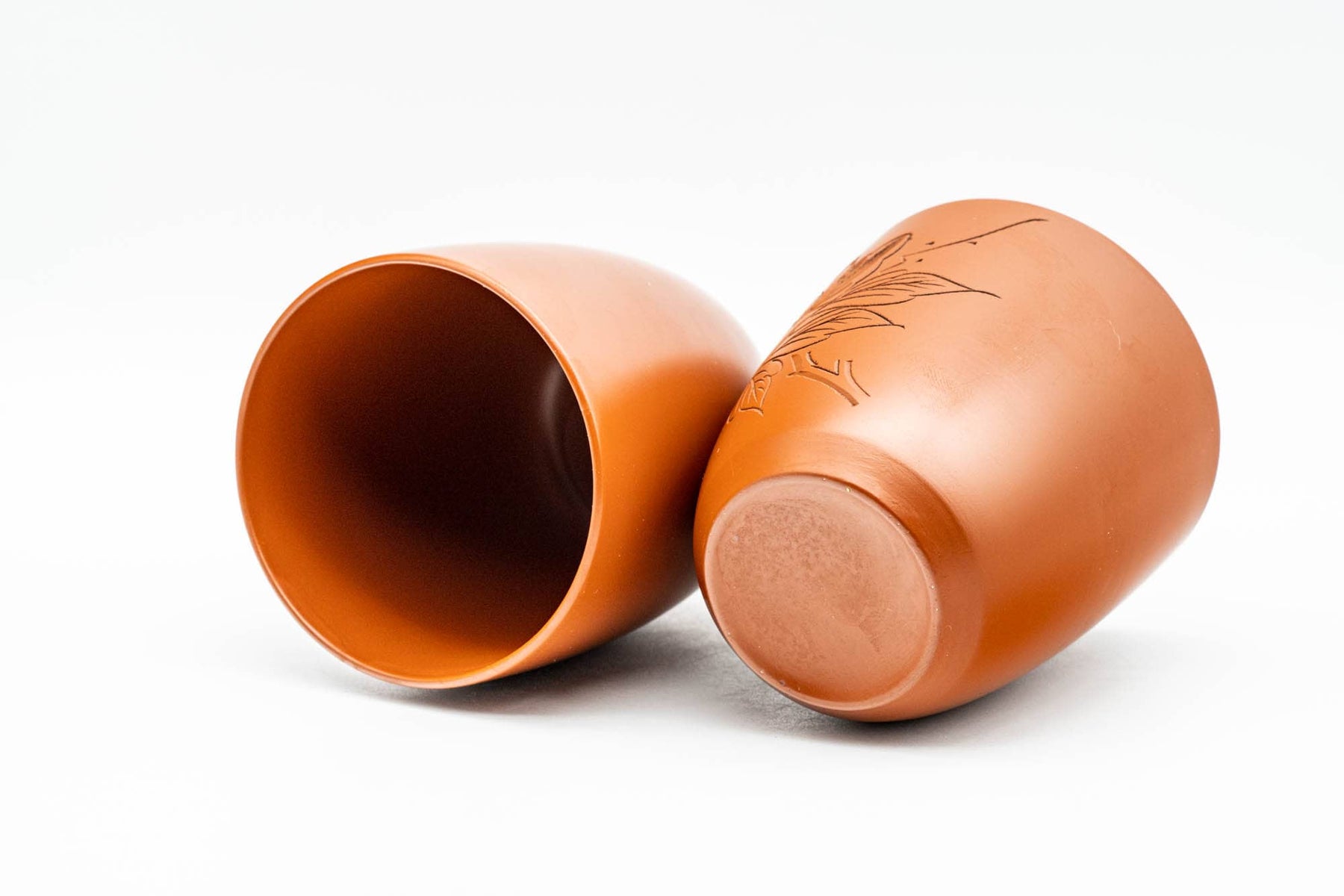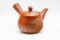 This Tokoname-yaki tea set includes one kyusu (teapot) and two yunomi (teacups) each featuring unglazed red shudei clay engraved with motifs of camellia. The teapot's built-in ceramic debeso filter is perfect for naturally straining tea.