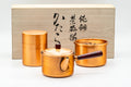 This slightly weathered tea set includes one kyusu (teapot), one kensui (waste water container), and one chazutsu (tea storage container) all made from metal and shipping in their original tomobako (wooden paulownia box).