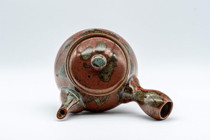 This Japanese tea set includes one kyusu (teapot), five yunomi (teacups), and five chataku (saucers), each featuring a metallic rust-red glaze accented by ares of brown drip glazing.