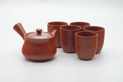 This Tokoname-yaki tea set includes one kyusu (teapot) and five yunomi (teacups) each masterfully engraved with flowers. The teapot's built-in ceramic debeso filter is perfect for naturally straining tea.