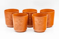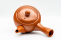 This Tokoname-yaki tea set includes a kyusu (teapot) with five yunomi (tea cups) made from red shudei clay and extravagantly engraved with camellia motifs. The kyusu's built-in ceramic debeso filter is perfect for naturally straining tea.
