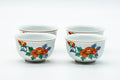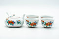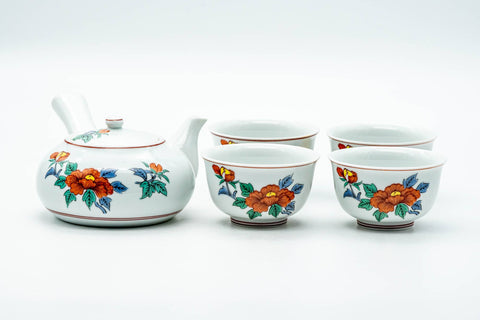 This Arita-yaki tea set includes one kyusu (teapot) and four yunomi (teacups) each made from white porcelain and decorated with floral motifs. The teapot's built-in ceramic debeso filter is perfect for naturally straining tea.