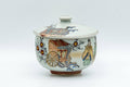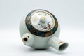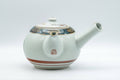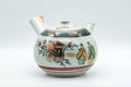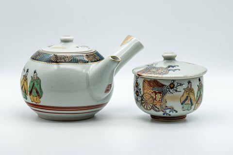 This elegant teapot and lidded teacup feature an Aochibu blue dot and golden flower pattern and are decorated with painting depicting scenes of old Japan, which contrast nicely with the clean white body.