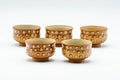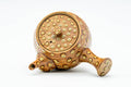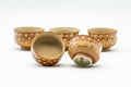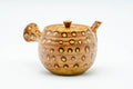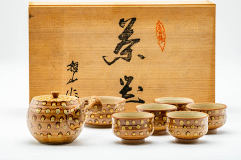 This unique tea set includes one kyusu (teapot), one katakuchi (water cooler; yuzamashi), and five yunomi (teacups) each featuring a brown glaze with spotted patterns. The teapot's built-in ceramic debeso filter is perfect for naturally straining tea.