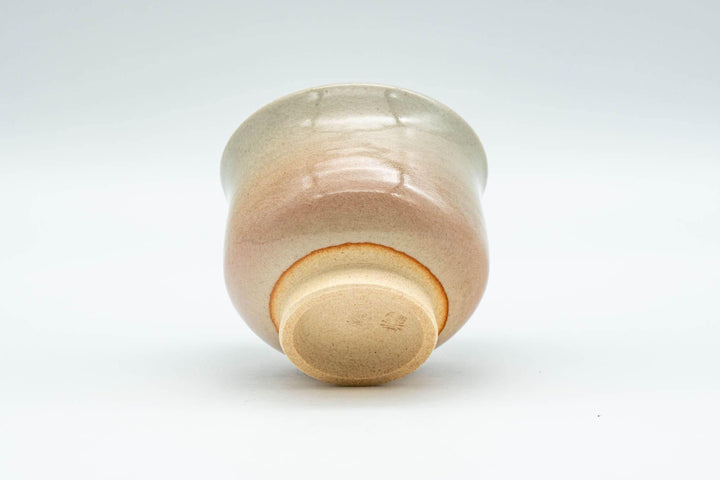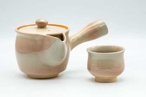 This Hagi-yaki tea set features a kyusu (teapot) and a matching yunomi (tea cup). The kyusu is made like a houhin, meaning that it has a wide, triangular open spout which allows for fast pouring, a simple ceramic do-ake filter which lends no metallic taste to the tea, and a wide opening which allows for easy viewing of the tea leaves and easy cleaning. This set is made from a warm, orange-hued stoneware with white glazing. Made by Tsubaki Kiln (椿窯, stamped 天鵬山).