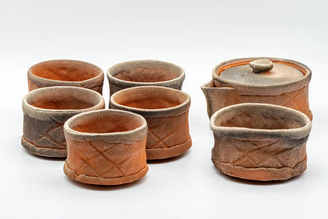 This wabi-sabi hand-formed unglazed Bizen-yaki tea set includes one houhin (handless teapot), one yuzamashi (water cooler), and five matching yunomi (teacups), all decorated with geometric motifs and featuring an earthy gradient from the wood-firing, transitioning from the warm orange hue of the bare stoneware to the grey-green of ash deposits. Compared to the perfect symmetry that potters can achieve by throwing on a wheel, handbuilt or hand-formed pieces retain a charming irregularity.