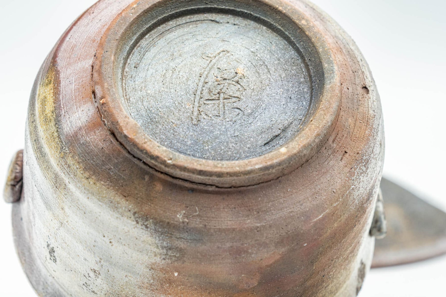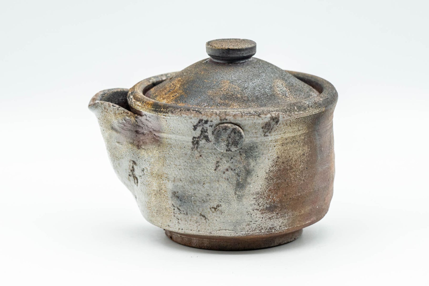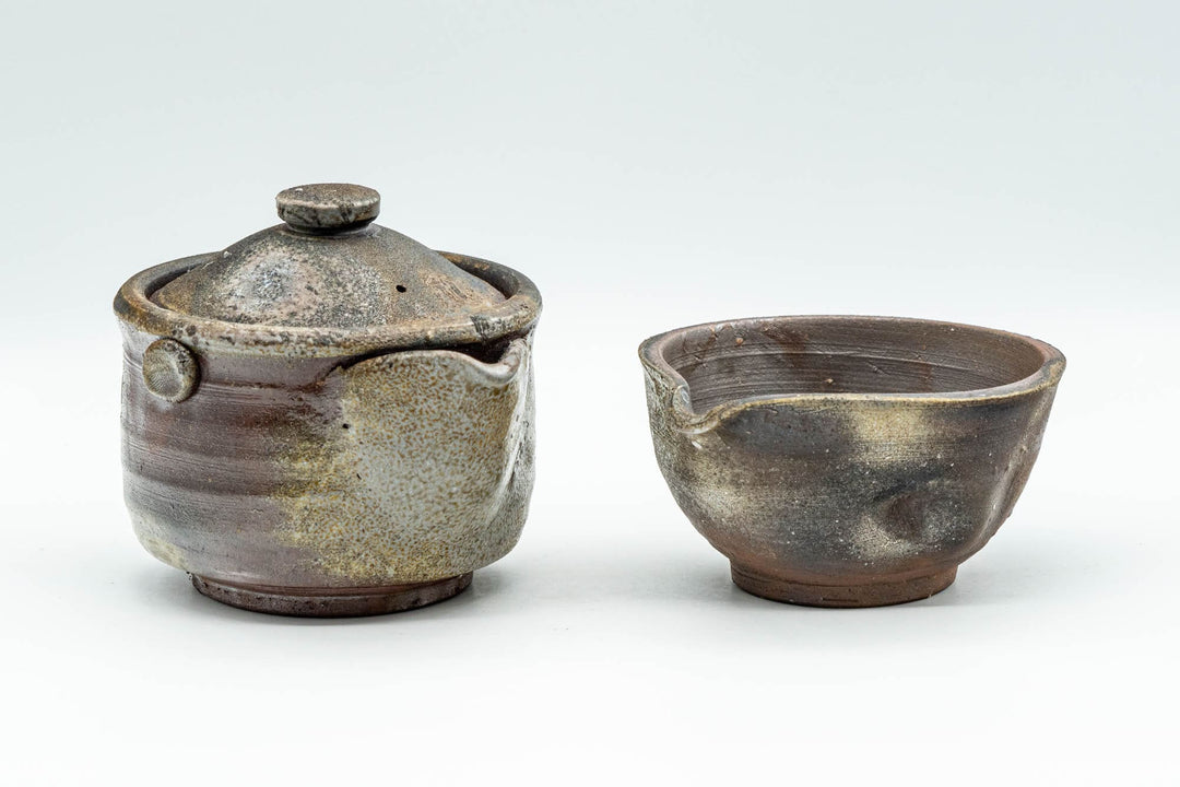 This Bizen-yaki houhin (handleless teapot) and matching handleless yuzamashi (water cooler, sometimes called a katakuchi) feature a rough earthen appearance and patches of ash glaze: results of being fired in a wood-fired kiln.