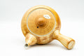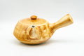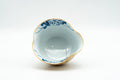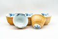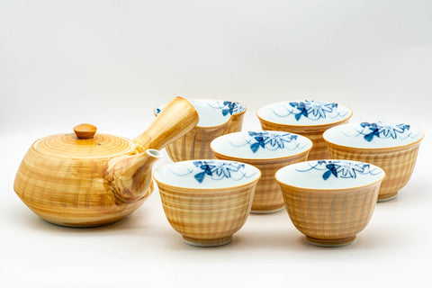 This porcelain Arita-yaki tea set includes one kyusu (teapot), one katakuchi (water cooler; yuzamashi), and five matching yunomi (teacups), each glazed in a brushed light brown exterior and a blue floral decorated interior. The teapot's built-in ceramic debeso filter is perfect for naturally straining tea, and the teacups have a white interior which lets you see the true colour of the tea.