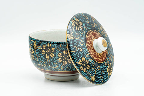 This Kutani-yaki lidded yunomi (teacup) features an Aochibu blue dot and golden flower pattern.
