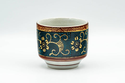 This Kutani-yaki yunomi (teacup) features an aochibu blue dot and golden flower pattern.