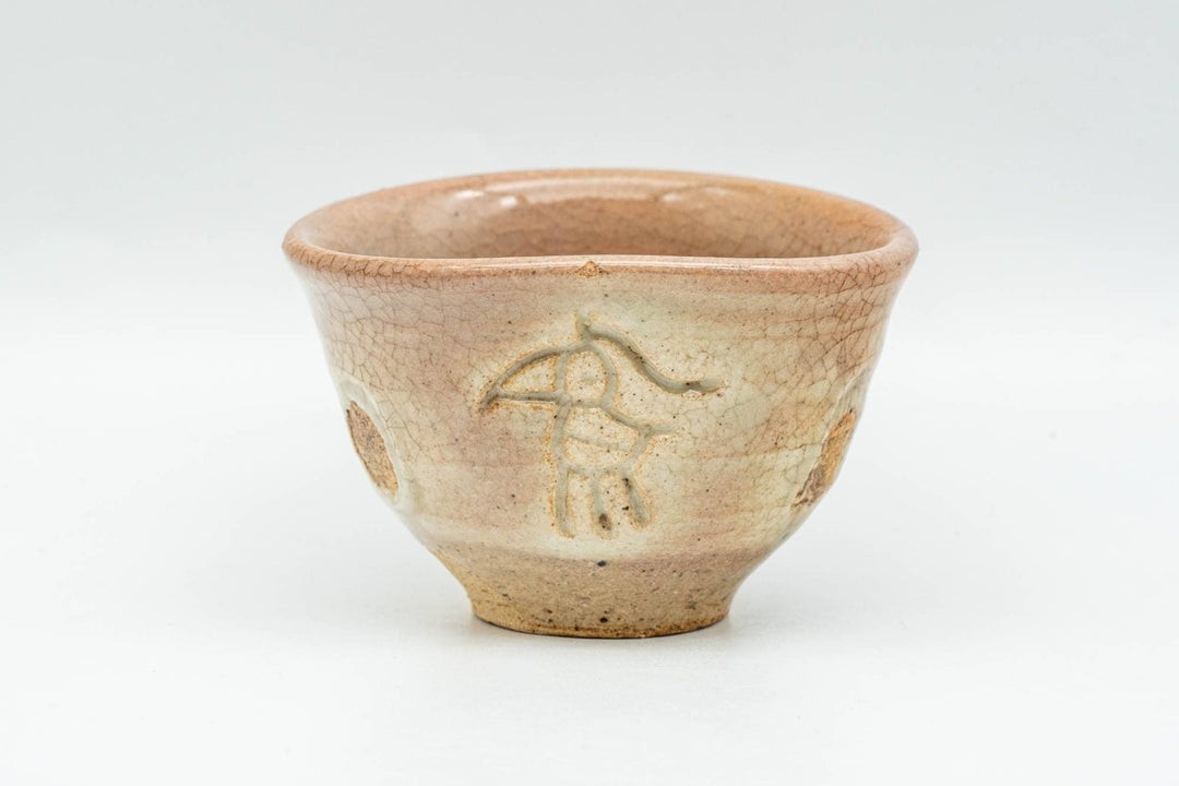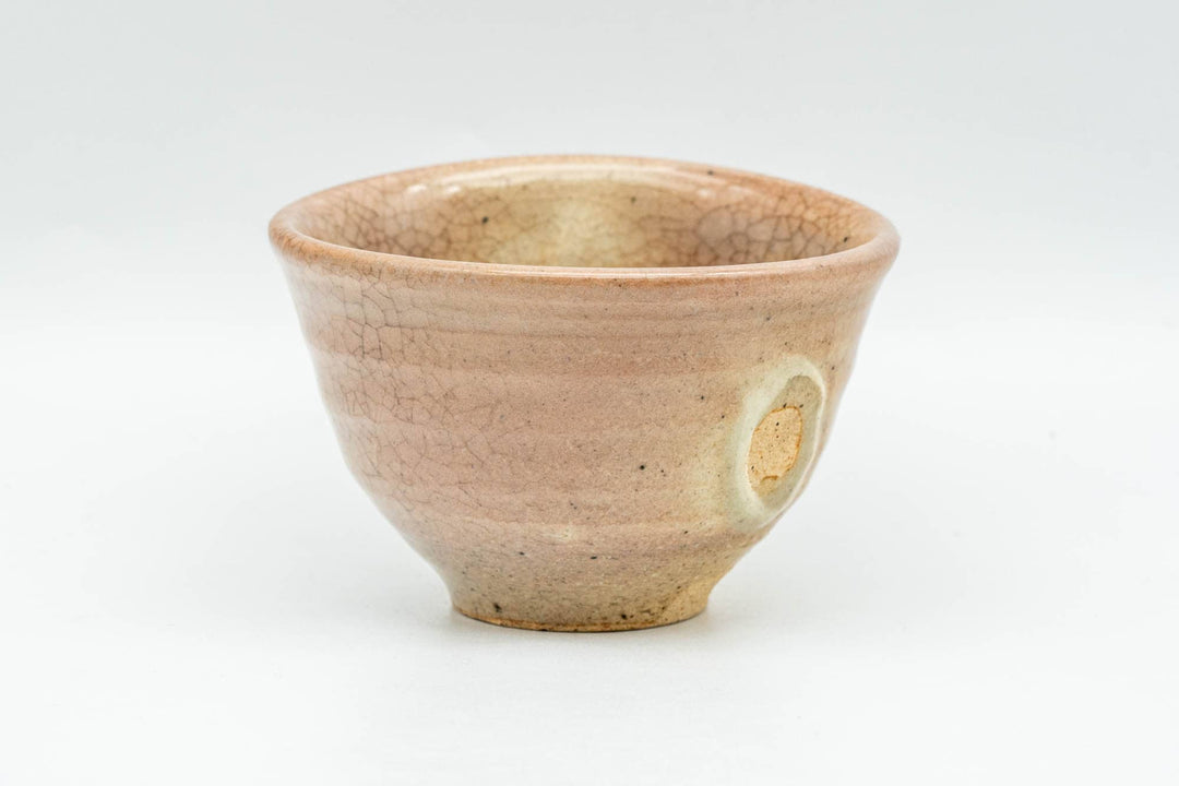 This beautiful guinomi (small teacup) is made from Hanshi, a warm beige-orange clay local to Shirakawa and Oriiyama in Uji said to resemble the morning sun, and features a crazed glaze with a 'gohonte'-style pattern of white spots.