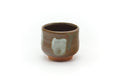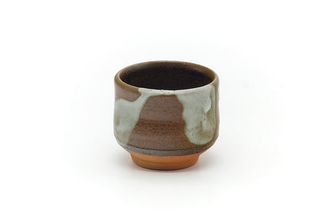 This yunomi (teacup) features an brown glaze with an abstract milky white overglaze.