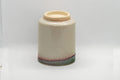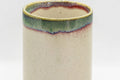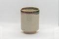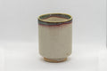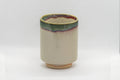 This tsutsu-gata yunomi (teacup) features a green enamel dripping over grey-glazed stoneware. This striking green colour of the enamel drip is caused by copper oxide and is one of the iconic styles of Agano ware.