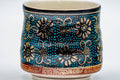 This Kutani-yaki yunomi (teacup) features an aochiba pattern of blue and gold flowers.