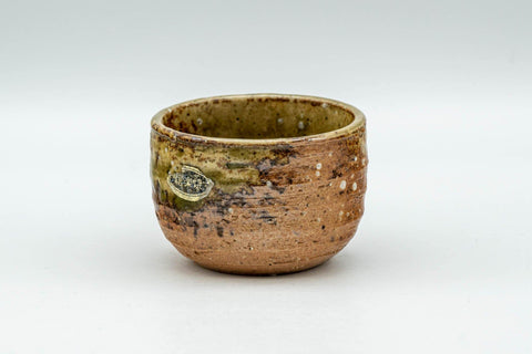 The Shigaraki-yaki guinomi (small teacup) features a spiral body with brown and ash-green glaze.