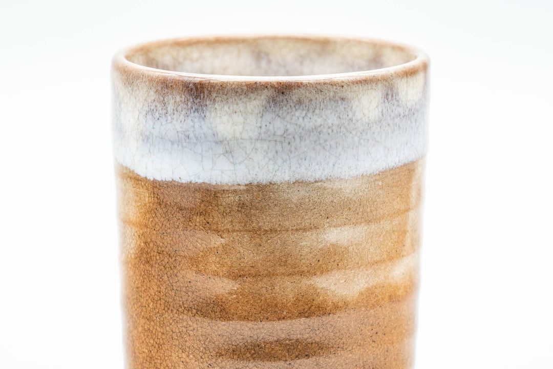 This Hagi-yaki yunomi (teacup) features a beautiful biege and brown glazed body with a white overglaze around its lip.