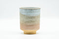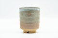 This Hagi-yaki yunomi (teacup) features a weathered dark beige glaze with peach gohonte spots and a white glaze over its lip.