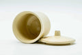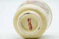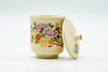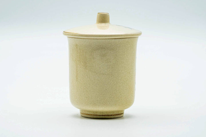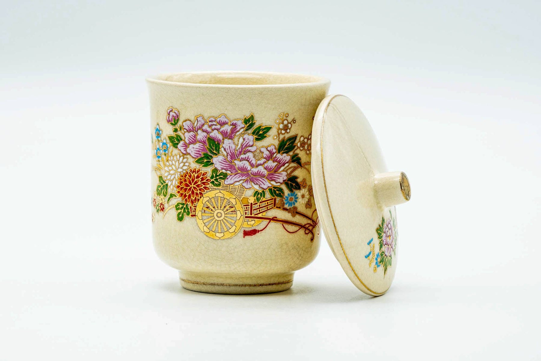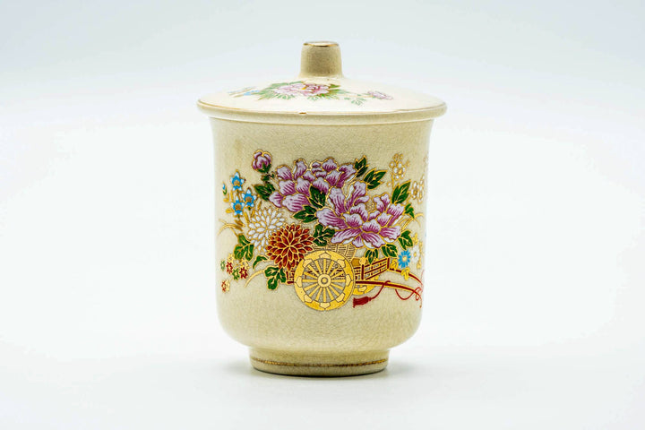 This Kiyomizu-yaki lidded yunomi (teacup) features a brilliant beige glaze decorated with flowers and gold trim.