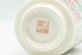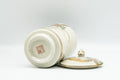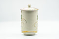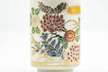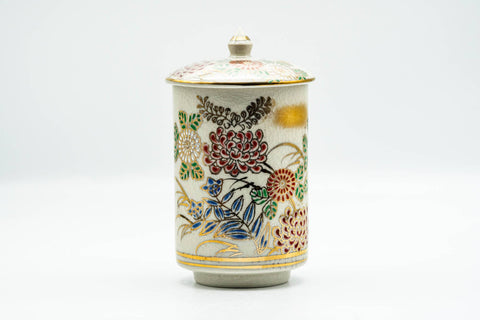 This Kutani-yaki lidded yunomi (teacup) features a beige glaze decorated with an assortment of multi-coloured flowers and gold trim.
