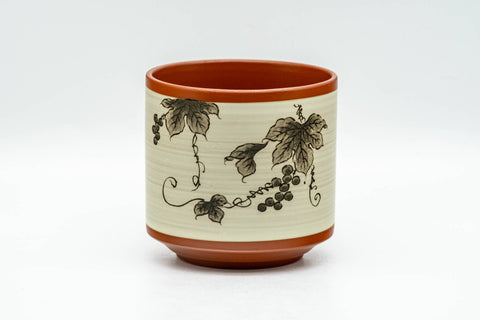 This Tokoname-yaki yunomi (teacup) features red shudei clay decorated with a beige momiji maple leaf and grapevine motif.