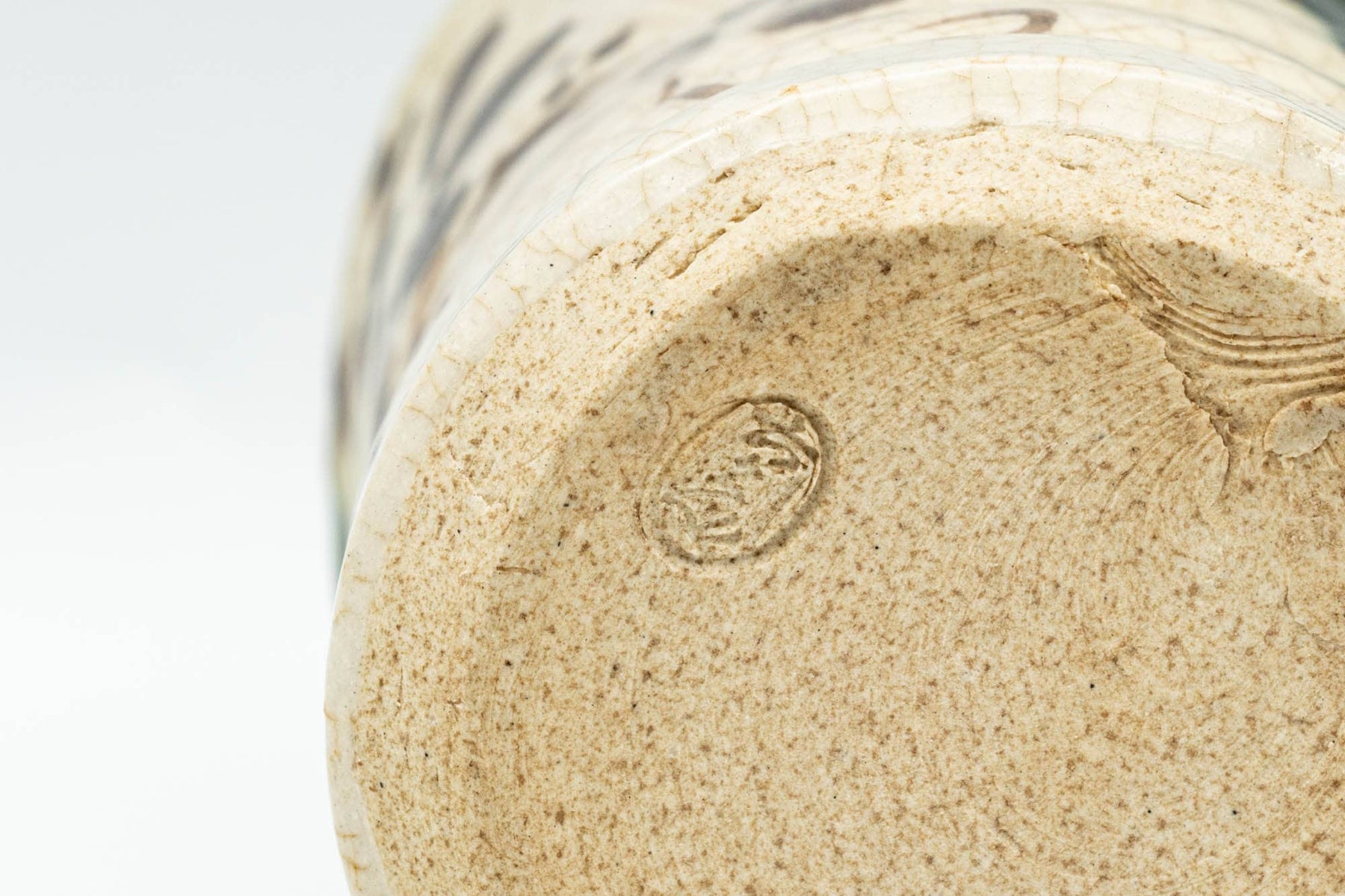 This Oribe-yaki yunomi (teacup) features a light beige glaze decorated with flowers and a green drip-glaze on two sides of its lip.