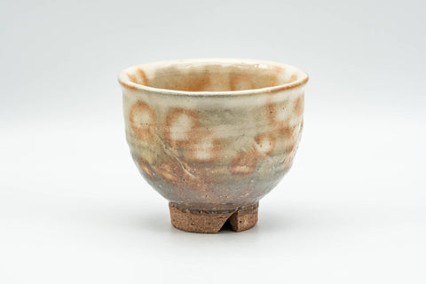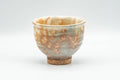 This Hagi-yaki yunomi (teacup) features a beautiful beige glaze with warm peach spots. This pattern is called 'gohonte'.