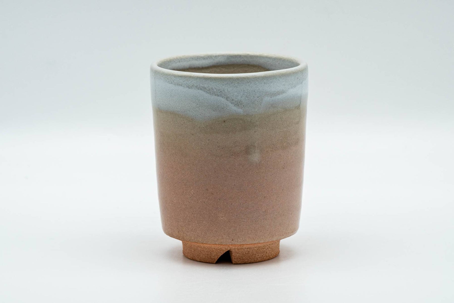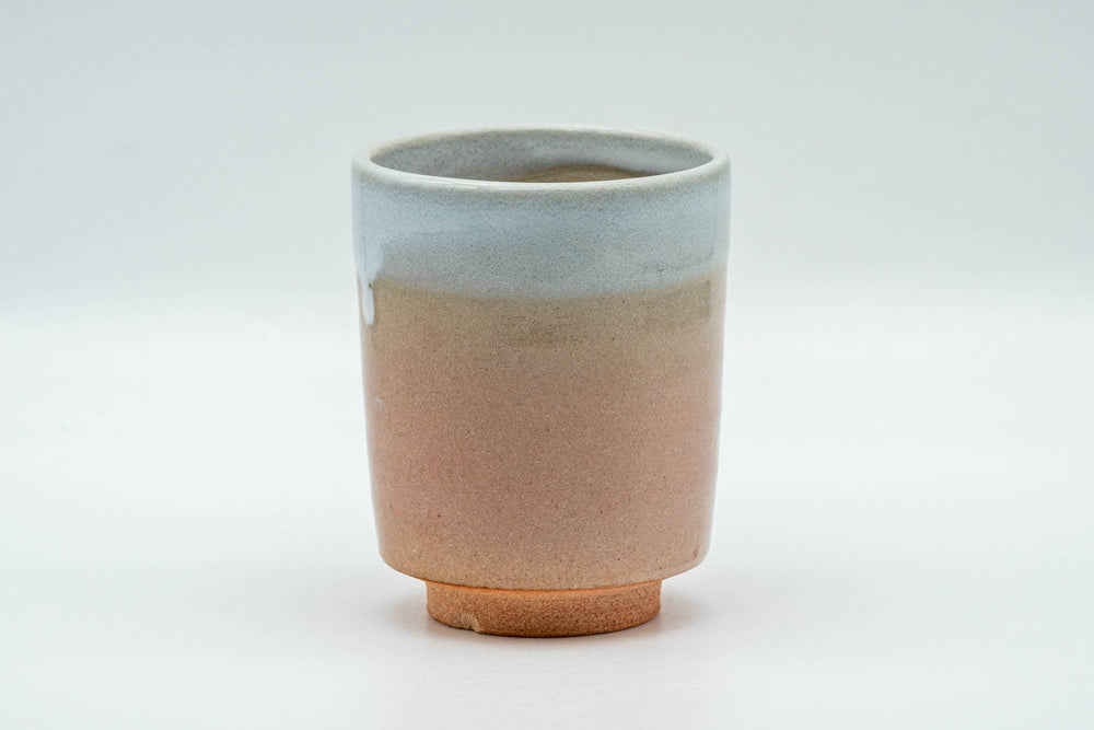 This Hagi-yaki yunomi (teacup) features a beige glaze that fades towards pink at its base, and a white overglaze around its lip.