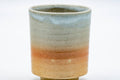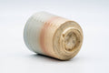 This weathered tsutsu-gata Hagi-yaki yunomi (teacup) features a classic beige and pink glaze with a white glaze over its lip.