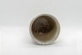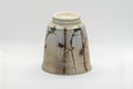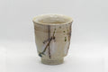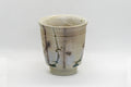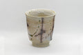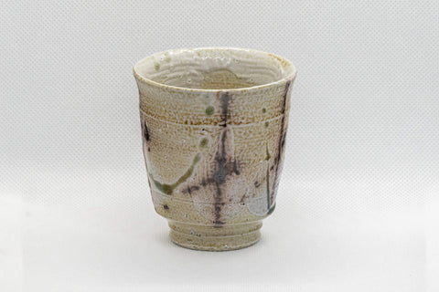 This beige tsutsu-gata yunomi features a mottled white glaze and decorations of green ash glaze and brown streaks