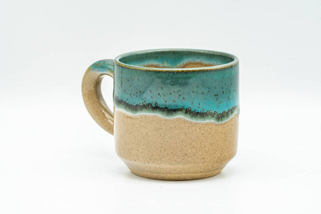 This Agano-yaki ushirode yunomi (rear-handled teacup) features a beige and turquoise drip-glaze.