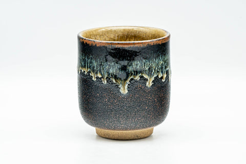 This yunomi (teacup) features a black-brown glaze, drip-glaze over its lip, and a crazed beige interior.