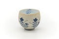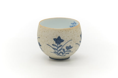 This Arita yunomi (teacup) is made from porcelain and decorated with blue floral motifs.