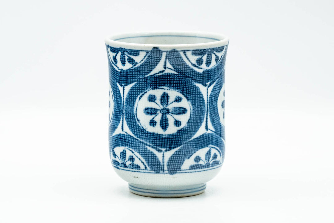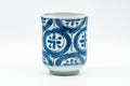 This Arita-yaki yunomi (teacup) is decorated with blue flowers and a geometric tessellation.