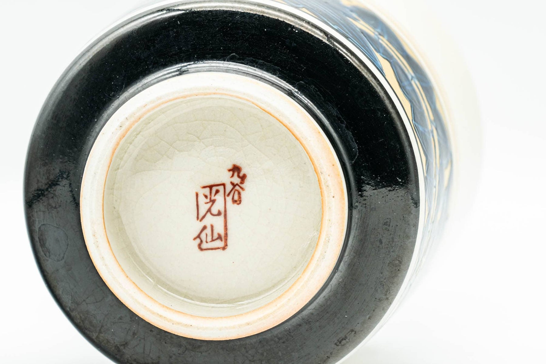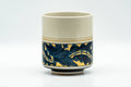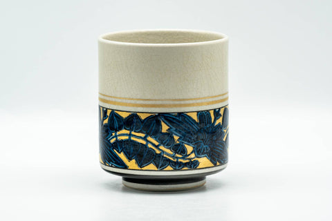 This large Kutani-yaki yunomi (teacup) features a beige glaze decorated with blue flowers and gold geometric patterns.