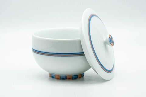 This Arita-yaki lidded yunomi (teacup) is decorated with blue and orange geometric patterns across its body and lid.