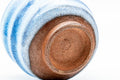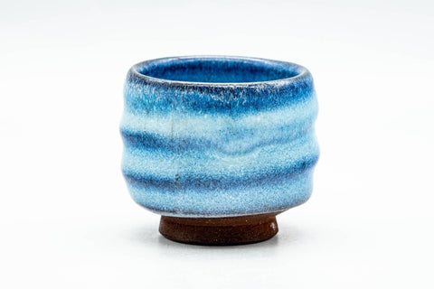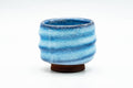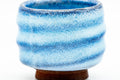 This amazing guinomi (small teacup) features a brilliant blue shino glaze over its spiraling body shape.