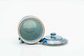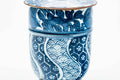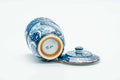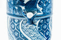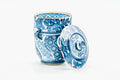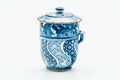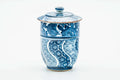 This Arita-yaki lidded yunomi (teacup) features marvelous geometric patterns and a small figurine scaling the outside wall.