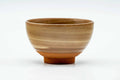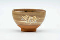This yunomi (teacup) features a brown and white spiraling glaze decorated with gold flowers