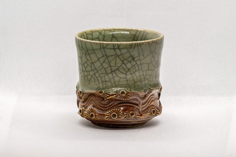 This crazed green celadon yunomi (teacup) features delicate carving at its base.