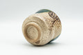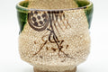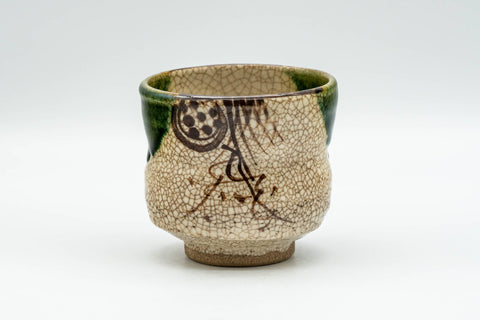 This Oribe-yaki yunomi (teacup) features a crazed beige and green drip-glaze with geometric patterns.